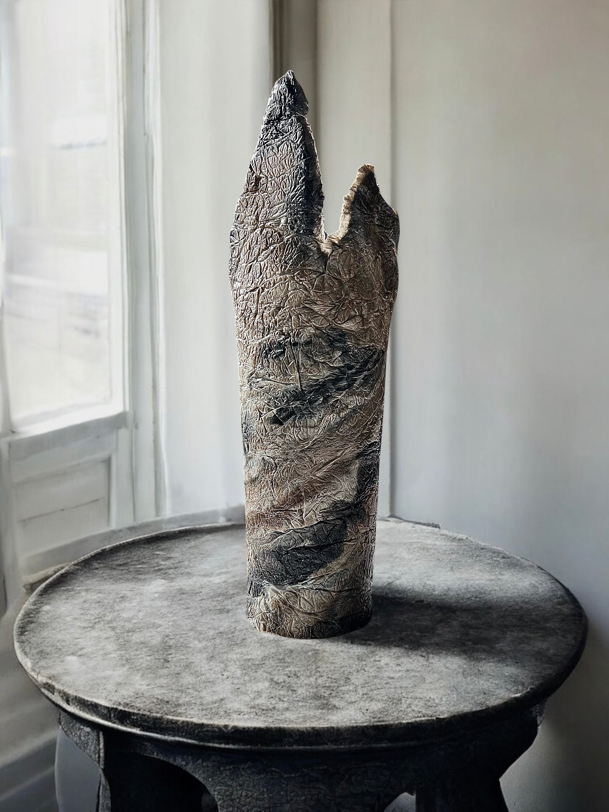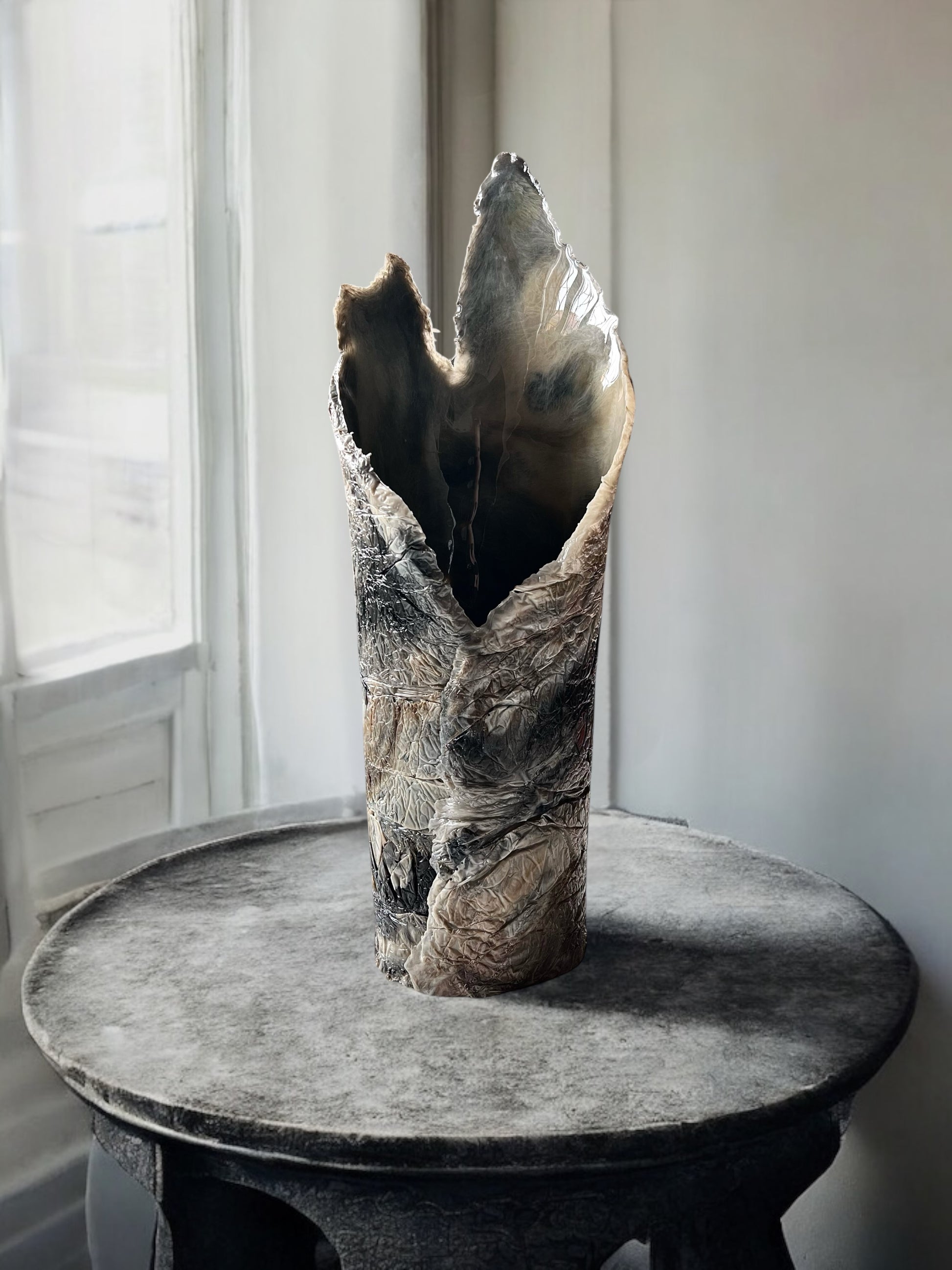 Realizzato a mano in resina, è caratterizzato da una superficie organica e materica, attraversata da venature che mescolano nero, beige e trasparenze, come strati geologici in continuo movimento.